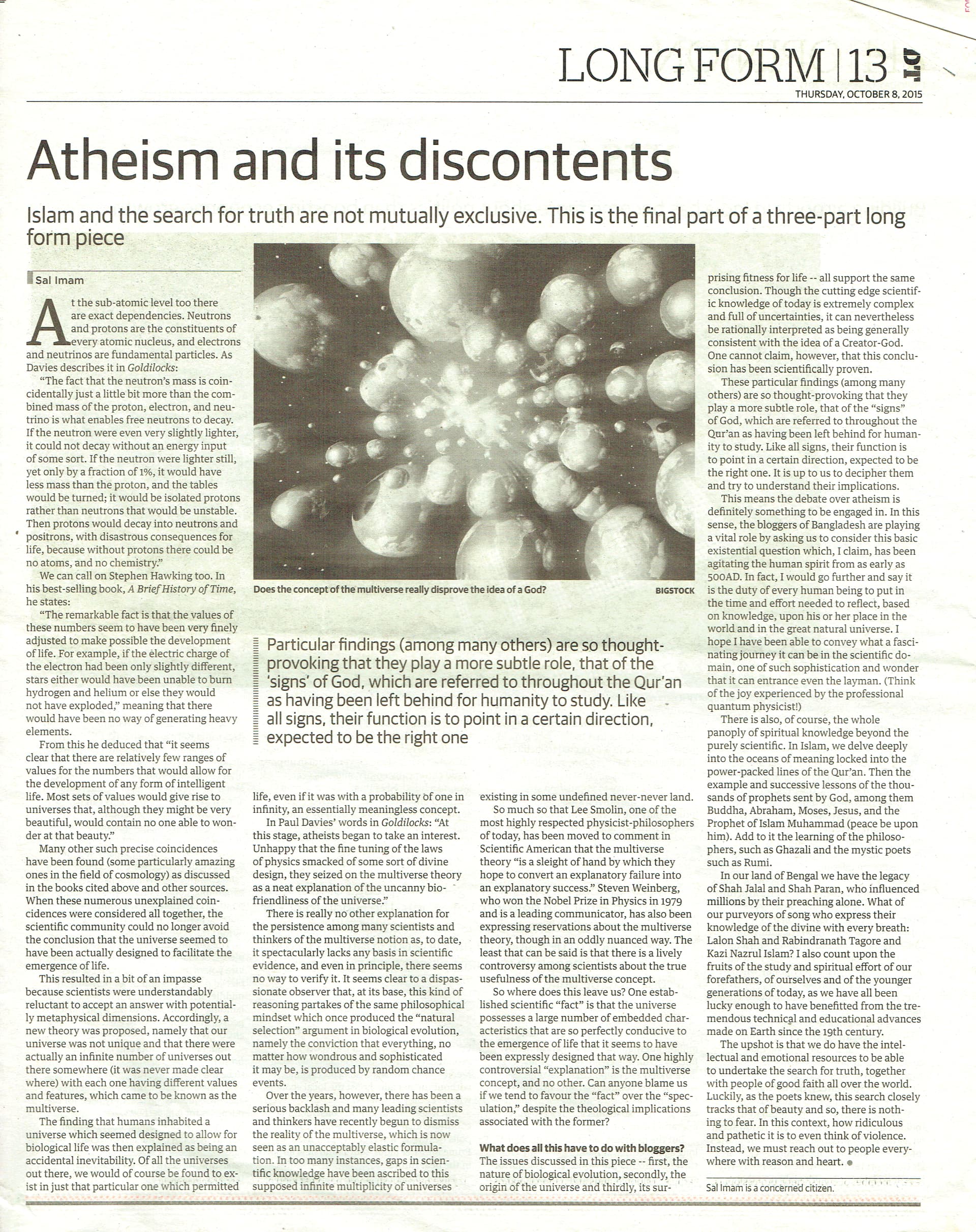 This means the debate over atheism is definitely something to be engaged in. In this sense, the bloggers of Bangladesh are playing a vital role by asking us to consider this basic existential question which, I claim, has been agitating the human spirit from as early as 500 AD. In fact, I would go further and say it is the duty of every human being to put in the time and effort needed to reflect, based on knowledge, upon his or her place in the world and in the great natural universe. I hope I have been able to convey what a fascinating journey it can be in the scientific domain, one of such sophistication and wonder that it can entrance even the layman. (Think of the joy experienced by the professional quantum physicist!)