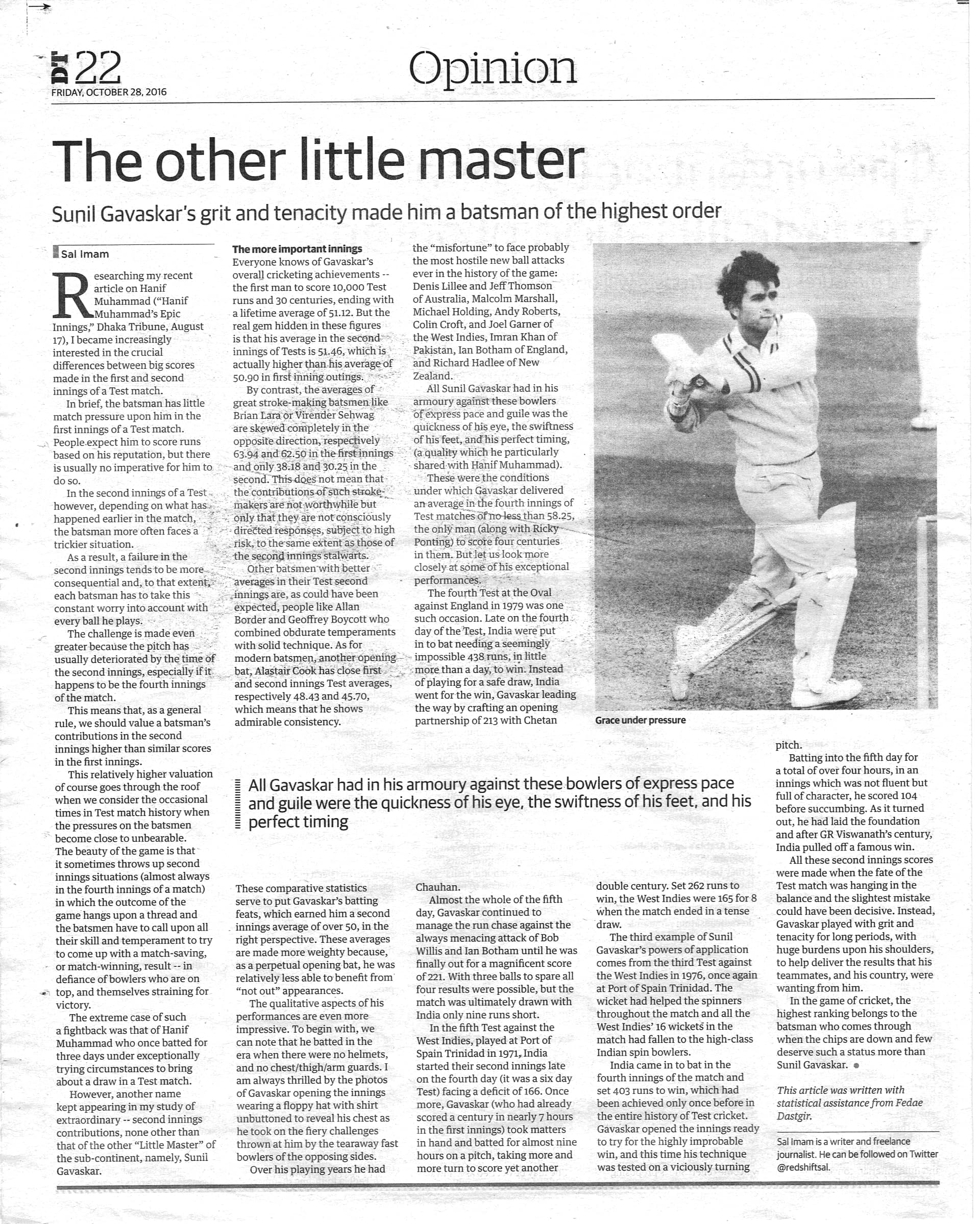 The extreme case of such a fightback was that of Hanif Muhammad who once batted for three days under exceptionally trying circumstances to bring about a draw in a Test match. However, another name kept appearing in my study of extraordinary — second innings contributions, none other than that of the other “Little Master” of the sub-continent, namely, Sunil Gavaskar.